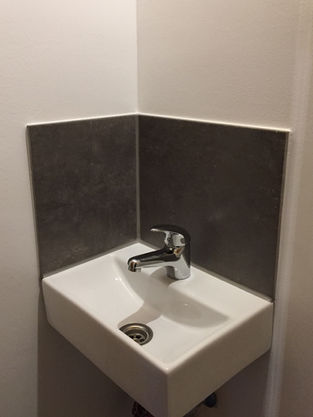 Bad: Dusche bodengleich, Spiegel, Waschbecken, Föhn, Waschmaschine, Wäscheständer
